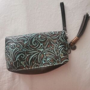 Patricia Nash Deep Mossy Green & Tooled Turquoise Etching Zipper Fold Wristlet C