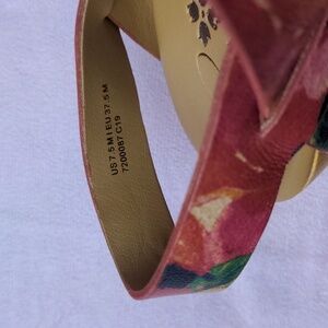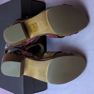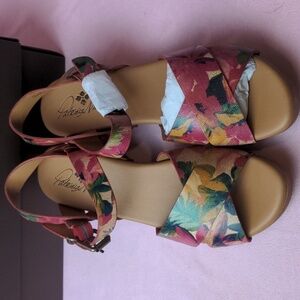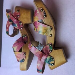 Patricia Nash Designs leather 70s retro inspired floral print platform sandals.