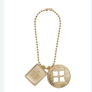 Elegant brass color double charm bag accent. Featuring a coin and tag design. Perfect for adding a touch of luxury to many handbags.