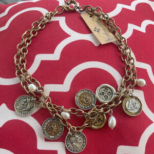 New Patricia Nash Double Charm Italian Silver Gold Necklace World Coin.