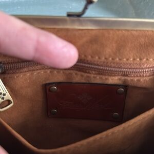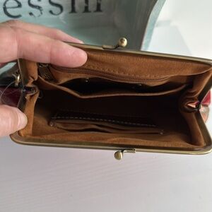 Patricia Nash larger wristlet bag featuring a vibrant floral design in red and green. Kiss lock closure, two open pockets and zippered pocket inside, no outside pockets. Perfect to carry your essentials, credit cards, cell phone, lipstick.