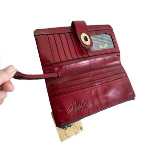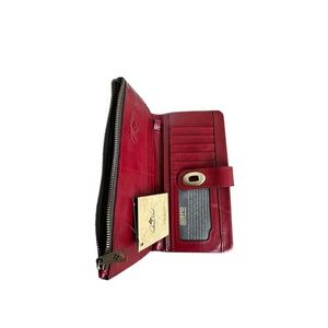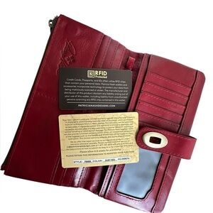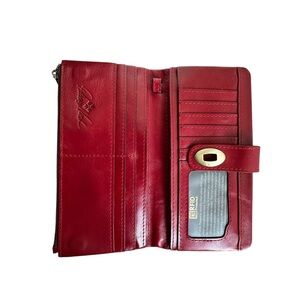 NWT Patricia Nash Annesley Leather Wristlet Wallet in Ruby Red. Brass Hardware, wristlet strap (convertible wallet/wristlet strap ticks back into the wallet spine when not in use.) Debossed logo accent, grained finish. W-8” x H-4”. 1 Zip pocket, 3 interior currency sleeves, 12 interior card slots, 1-ID Window, 1 Back Zip Pocket. Amazingly soft, pliable leather, with a sheen finish. Pics taken by Seller and represent the exact item you will receive.