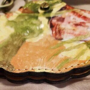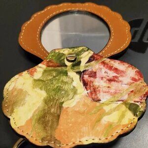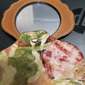 Patricia Nash Bellisara seashell leather mirror with fob. The mirror and case measure approximately 3 1/4" x 3 1/2", not including the fob/keychain. The plastic is on the mirror.