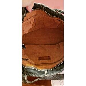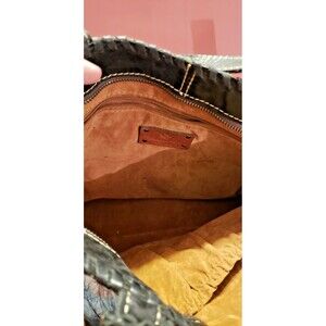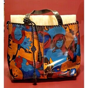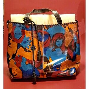 The Patricia Nash Leather Purse / Shoulder Bag / Tote is a large rectangular bag with a zip closure and double black handles, perfect for various occasions such as travel, weddings, parties, casual outings, work, and business. Made of multicolor leather with stitching accents, this bag features a vibrant pattern of flowers and faces, adding a playful touch to its stylish design. The antique brass hardware and suede lining in a caramel color complement the overall colorful theme of the bag, making it a standout accessory for any outfit.