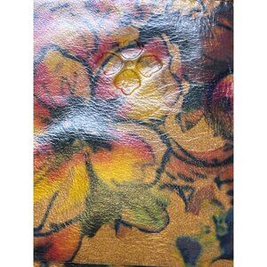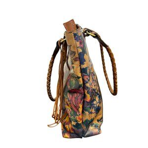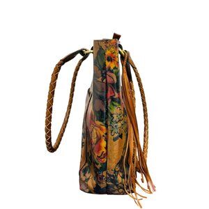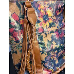 This Patricia Nash tote combines craftsmanship with a vibrant floral leather design. Its braided handles and tassel accents enhance functionality and style.