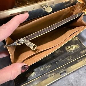 Make a bold, vintage-inspired statement with this Patricia Nash embossed leather wallet. Crafted from genuine leather in a rich antique gold and black finish, it features Patricia Nash’s signature hand-tooled floral design and brass-tone frame clasp for a timeless, heirloom look.