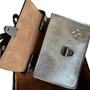 New! Patricia Nash Mini Lanza Push Lock Crossbody Bag. Color: Antique Platinum. W-5.5” x H-4.25” x D-1”. Detachable Crossbody Strap 58” Extension. Golden Faux Suede Lined Interior. 1 Slot Card Holder. Brushed Antique Silver Tone Hardware. Debossed Brand Logo Accent. Comes in Gift Box. Seal on gift box was opened by me to take pics. All Pics here are by Seller (except last 2 stock photos) and represent the exact item you will receive.