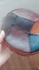Round leather crossbody with patchwork design. Features a mix of vibrant colors. Ideal for casual outings.