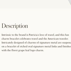 Travel is so exciting. Why not celebrate your travels with this fun charm bracelet. Intricately designed charms are suspended on a bracelet of etched oval signature, metal links, and finished with the floral grape leaf logo charm.