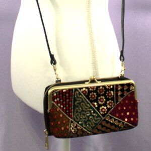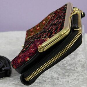 Stand out with this stunning Patricia Nash crossbody wallet on a string, featuring an intricate patchwork design of embroidered patterns with gold metallic threading and sequins. Versatile and stylish, this piece can be worn as a crossbody, carried as a clutch, or used as a large wallet.