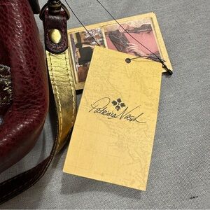Patricia Nash "Provencal Escape" handbag, embroidered leather satchel. Burgundy leather with navy, gray and gold metallic floral-patterned embroidery. Rolled leather handles with removable shoulder strap with brass hardware. Flat bottom with brass feet. Large open compartments on the front and back, recessed top zip opening, fully lined gold faux suede interior with two slip pockets plus one zip pocket. 13x8x4, 5" handle drop/22-28" strap drop. New with tags, includes original dust bag. Classic and timeless. Dust bag included.