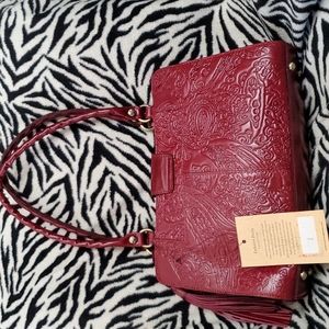 wine color with brass studs and hardware, Gorgeous NWT- rare paisley tooled burgundy leather bag=I loved it so much, I ended up buying 2 (just in case)! But I have to do some closet clean out!! Comes with dust bag. Dual, leather-covered twisted rope handles;
