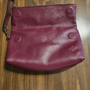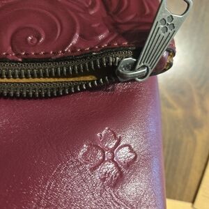 This Patricia Nash clutch showcases a luxurious red leather with intricate embossed patterns, offering a blend of classic elegance and artisanal craftsmanship. The fold-over design adds a touch of sophistication, making it a perfect accessory for any occasion.