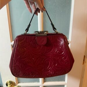 Chic shoulder bag with floral embossed design. Rich red color. Perfect for any occasion.