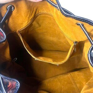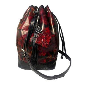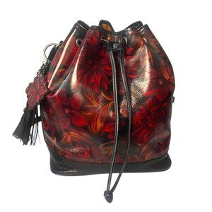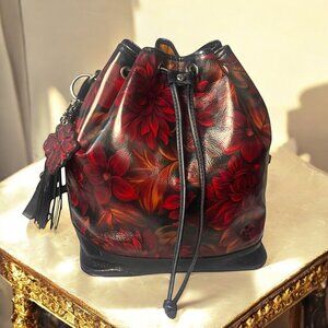 Elegant crossbody bag with vibrant floral design. Features drawstring closure and adjustable strap. Perfect for any occasion.