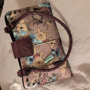 Excellent used condition Patricia Nash Rienzo shoulder bag in Dusty Rose abstract floral print coated leather. No call outs and from a smoke-free home.
