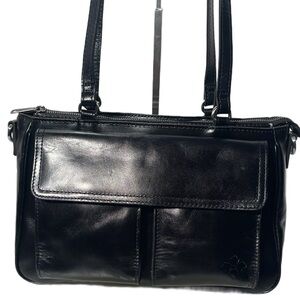 Get the sophisticated black leather satchel crossbody bag all in one. Two top handles and the multi-pocket and pouches that will make your life easy to organize. (Missing crossbody strap) Exterior has two front flap snap pockets. Other side has big slip pocket. Top has zipper closure with all brushed silver tone hardware. Interior has faux suede velvety fabric one side zipper pocket and two side open pockets. Practically new please view all photos carefully it does have scratches on front flap pockets and little scuffs on exterior. Handles in excellent condition.