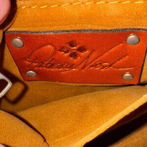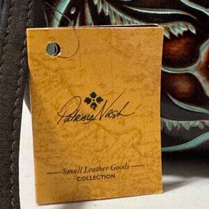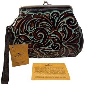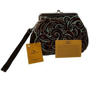 Patricia Nash Savena Wristlet Tooled Turquoise Brown Leather Kiss Lock Clutch