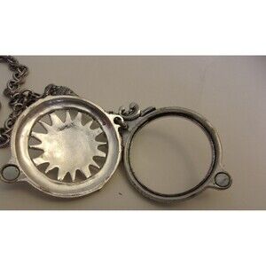 The rear opens to another circle -- it looks like it should have a magnifying glass inside of it--but it doesn't and I'm not sure if it is supposed to or ever did. It magnetically attaches to the from design.