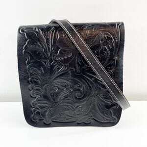 adjustable long crossbody strap, flap closure, leather, western, tooled front, lined interior, bag, purse