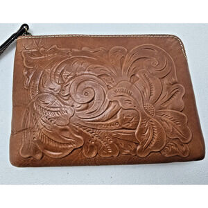 * Made of leather with a floral tooled finish, this wristlet features antiqued brass-tone hardware, deep embossed logos, and a wrist strap handle in tan Florence color.