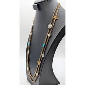 Patricia Nash Two Strand Antique Gold/Bronze Chain Two Tone Beaded Necklace. Shortest chain is approximately 32" long. Silver tone, bronze tone Nash symbol stations, faux pearls and bright blue beads. Pre-owned, this necklace is in excellent condition. Sailor or mariner's clasp with Nash dangle at neck.
