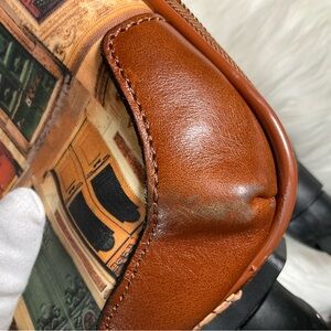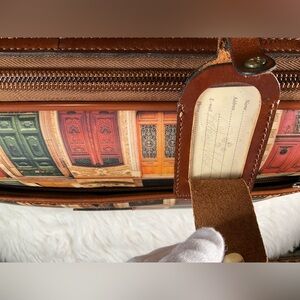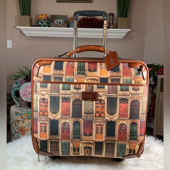 Stylish rolling suitcase with a colorful door print. Features leather accents and a sturdy handle.
