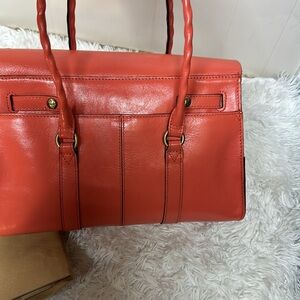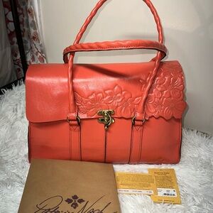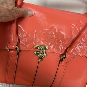 Gorgeous Patricia Nash Vienna Leather Satchel Purse Tooled Floral Bag in Coral. Sold out in stores. This polished statement satchel features distinctive hand-cut tooling, a unique hook-lock closure, supple leather that develops even more character over time, and twisted rope leather handles. Heads will turn everywhere you go carrying the Vienna.