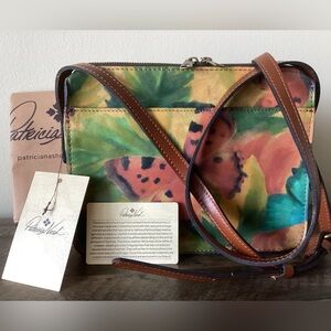 All new with tag Patricia Nash Watercolor Butterfly Vallata crossbody bag. 100% full grain leather, 2 front slip pockets with magnetic snaps, interior compartment with zip pocket and 2 slip pockets, zipper closure, and adjustable crossbody strap. Dust bag included.