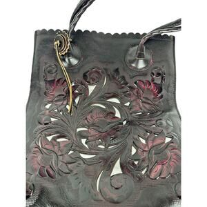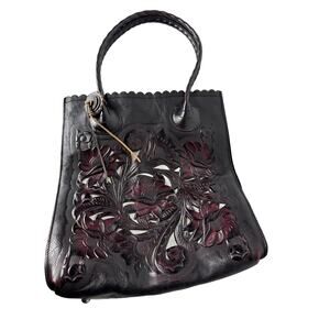 Patricia Nash Womens Tooled Floral Cut Out Metallic Inlay Brown Leather Tote Bag