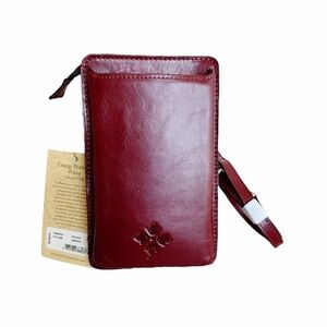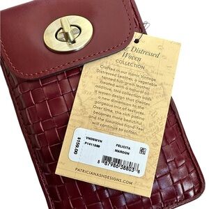 NWT Patricia Nash Falicita Woven Leather Phone Crossbody Bag. (Not your standard Phone Case.) RFID Protection. Color: Maroon W-5” x H-7.5” x D-2.5”. Gold Tone Hardware. Gold Faux Suede Leather Interior. Triple Compartment Design. Exterior Back Open Slip Pocket- Phone Pocket. Central Zip Top Closure Compartment. Front Pouch with Turn Lock Closure. Crossbody Strap is adjustable, and extends up to 53 inches. Burned edge finish. All Pics taken by Seller (except for last 2 stock photos) and represent the exact bag you will receive.