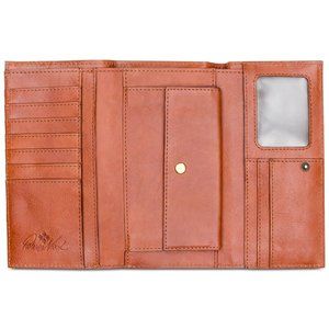 Features: Front snap closure, 1 exterior back slip pocket, 1 interior clear ID pocket, 9 credit card slots, 1 center snap change pocket & 4 bill pockets.