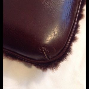 Unique bag in chocolate with leather on one side & Sherpa on the other. Snap at outer pocket. Has a few marks that I tried to capture in close ups. Eye catching!