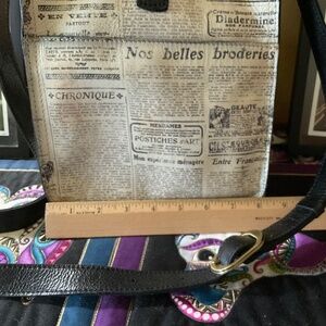 French newspaper print on Italian Leather crossbody bag with small wallet. This is a narrow but tall bag.