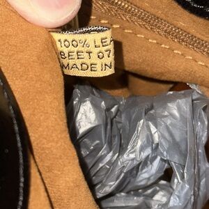 Preowned. Color, black and white. Main compartment snaps shut. Back zipper pocket. Leather shoulder strap and cross body strap included. Inside center zipper pocket. Also inside zipper pocket various other pockets. This handbag is super clean and all leather. Measure approximately 10 inches across 8 1/2 inches deep 4 1/2” across the bottom handle drop is 6 inches. Crossbody strap is 23 inches fully extended.