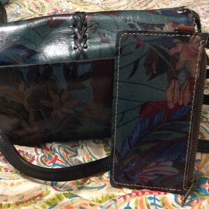Patricia Nash floral print leather purse with matching wallet sleeve. Used once. Excellent condition. Wallet sleeve 5 and half inches wide . Purse 6 inches talll by 8 inches wide has 2 zipper compartments as well as two open compartments. One open compartment on back side.