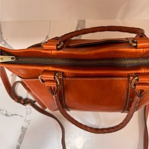 The spacious interior is fully lined and features multiple slip and zip pockets to keep essentials organized. Dual leather shoulder straps and cross body strap provide comfortable carry, while the structured silhouette makes it perfect for everyday use or travel.