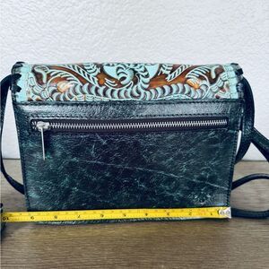 Patricia Nash Lanza brown and turquoise teal blue tooled leather floral pattern crossbody bag purse. See photos for measurements. New unused and in perfect condition.