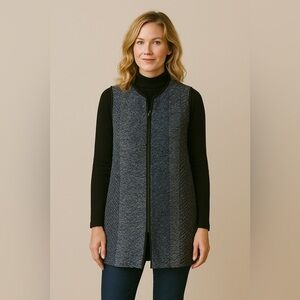 women’s vest, long vest, textured vest, sleeveless jacket, layering piece, zip front vest, blue grey vest, fall fashion, winter layering, office casual, chic vest, woven vest, chevron pattern vest, cozy vest, boho vest, minimalist vest, mid thigh vest, versatile vest
