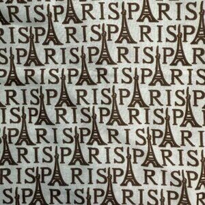 Features an allover brown "PARIS" and Eiffel Tower motif pattern with solid brown border.