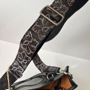 Beautiful well-made purse by Patricia Nash. Lovely roomy interior. In excellent preowned condition with a small red mark, pictured. Beautiful floral crossbody strap that is brand new. Embellished antiqued grommets.