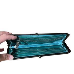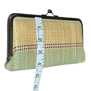 This stylish wallet features a sleek straw exterior with a vibrant teal leather interior. Perfect for organizing your essentials with elegance.
