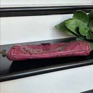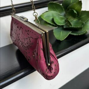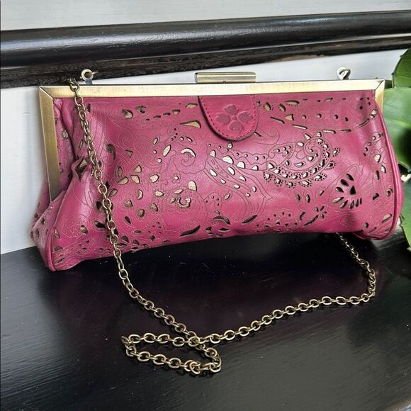This stunning Patricia Nash genuine leather shoulder clutch is a perfect mix of elegance and versatility. Crafted in a rich berry pink leather with intricate cut-out floral and paisley designs, this bag showcases Patricia Nash’s signature vintage-inspired craftsmanship. The frame-style top has a secure kiss-lock closure, and the interior is lined with soft suede featuring a zip pocket for organization.