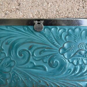 Elegant teal wallet with floral embossing. Features a secure clasp closure. Perfect for everyday use. Check out the pictures. This wallet is in clean condition. Measures 7.5 x 4.25 and has space for 10 credit cards.