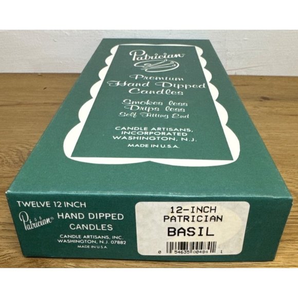 Hand-dipped taper candles from Patrician in a Basil (Green). These 12-inch candles are new and come in a pack of 12.