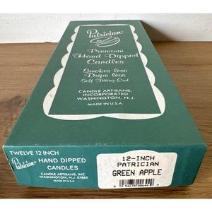 Set of 12 Patrician green apple hand-dipped tapered candles in a 12-inch size. New in box. Ideal for creating a warm, inviting atmosphere in any setting.