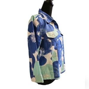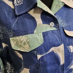 3/4 sleeve lightweight ocean inspired jacket. Blue, white, sea green button up with 2 front button pockets, no buttons on cuffs. Size M