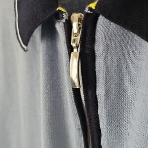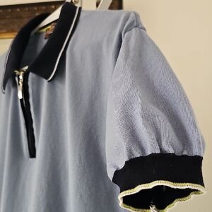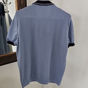 Elegant blue polo with black trim. Features a zip closure. Ideal for casual wear.