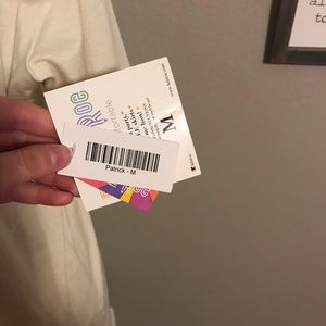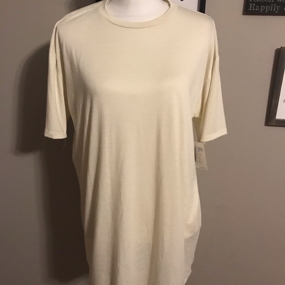 M Patrick tee. The seem in the back has snags - it is pictured. Brand new with tags. Never worn. The color is an off white beige. Pet friendly smoke free.