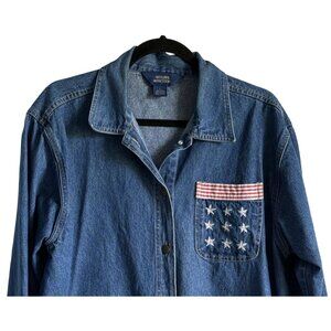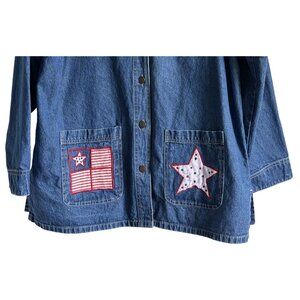 This denim Barn jacket/ Chore coat from Natural Impressions offers a patriotic touch with star and stripe patches on a durable cotton fabric. It is crafted for comfort and style, suitable for versatile settings. The jacket's classic design complements its unique embellishments, making it a standout piece for casual wear. Women's size large. Pre owned in good condition.